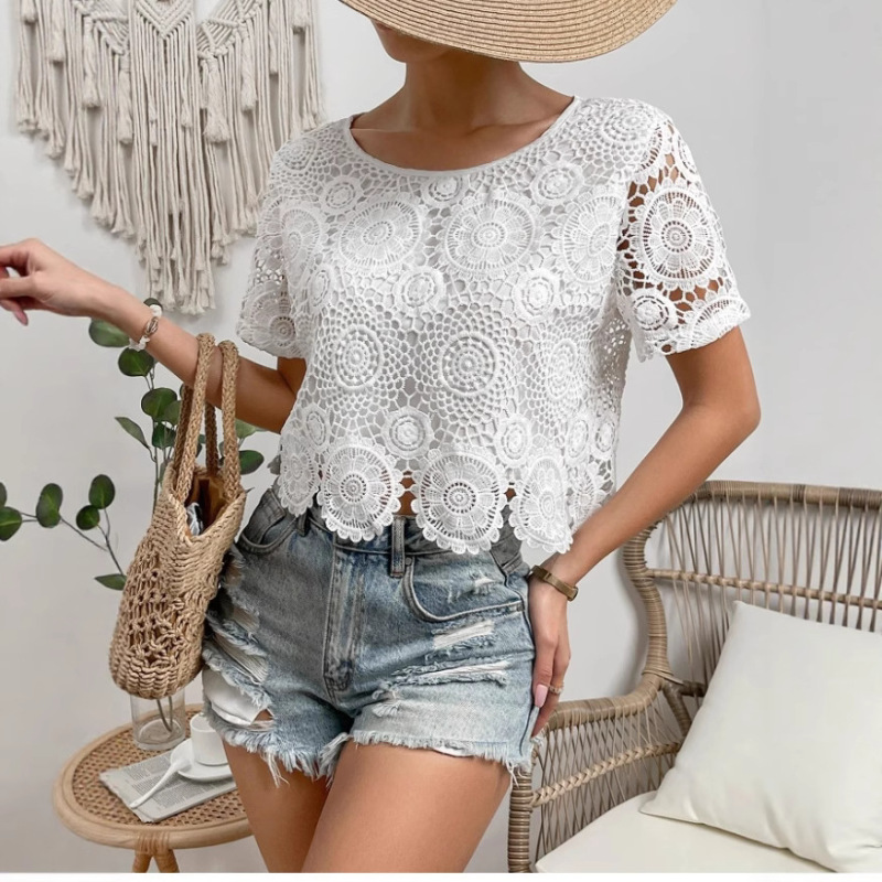 French Heavy Industry Hook Flower Hollow Out Design With Floral Short Sleeved Women's Summer Lace Lace Lace, Slimming And Sexy Outerwear Top