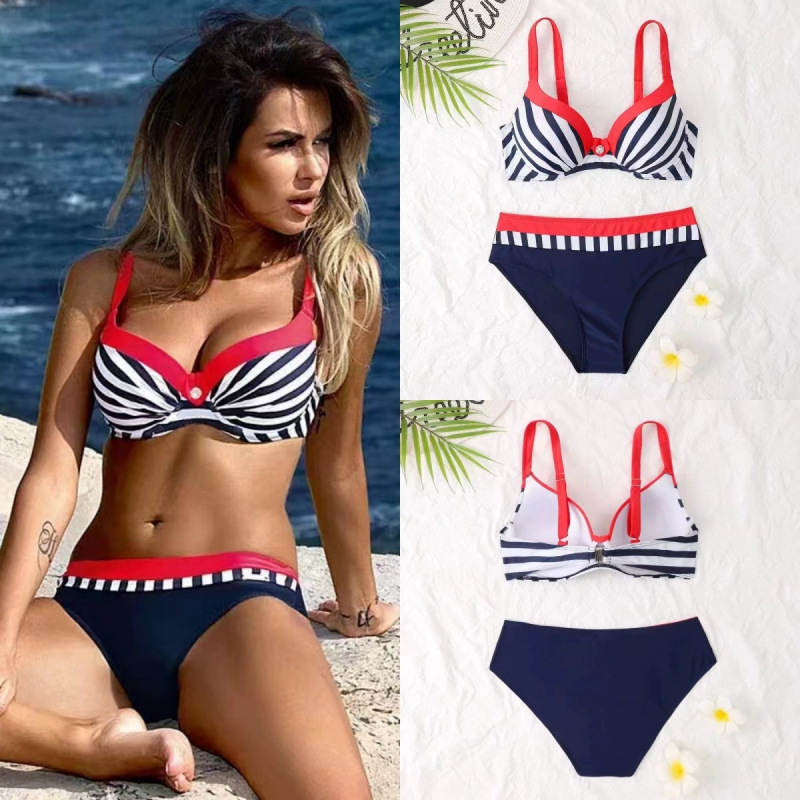 2025 European And American Swimwear Big Chest Gathered Bikini Plus Size Swimsuit Bikini European And American Popular Striped Split Swimsuit