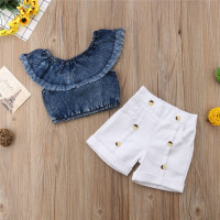 Girls'Suit 2019 New Korean Version Children's Suit Two-piece Suit For Children's Lotus Leaf Collar Jeans With Short Sleeves And White Shorts
